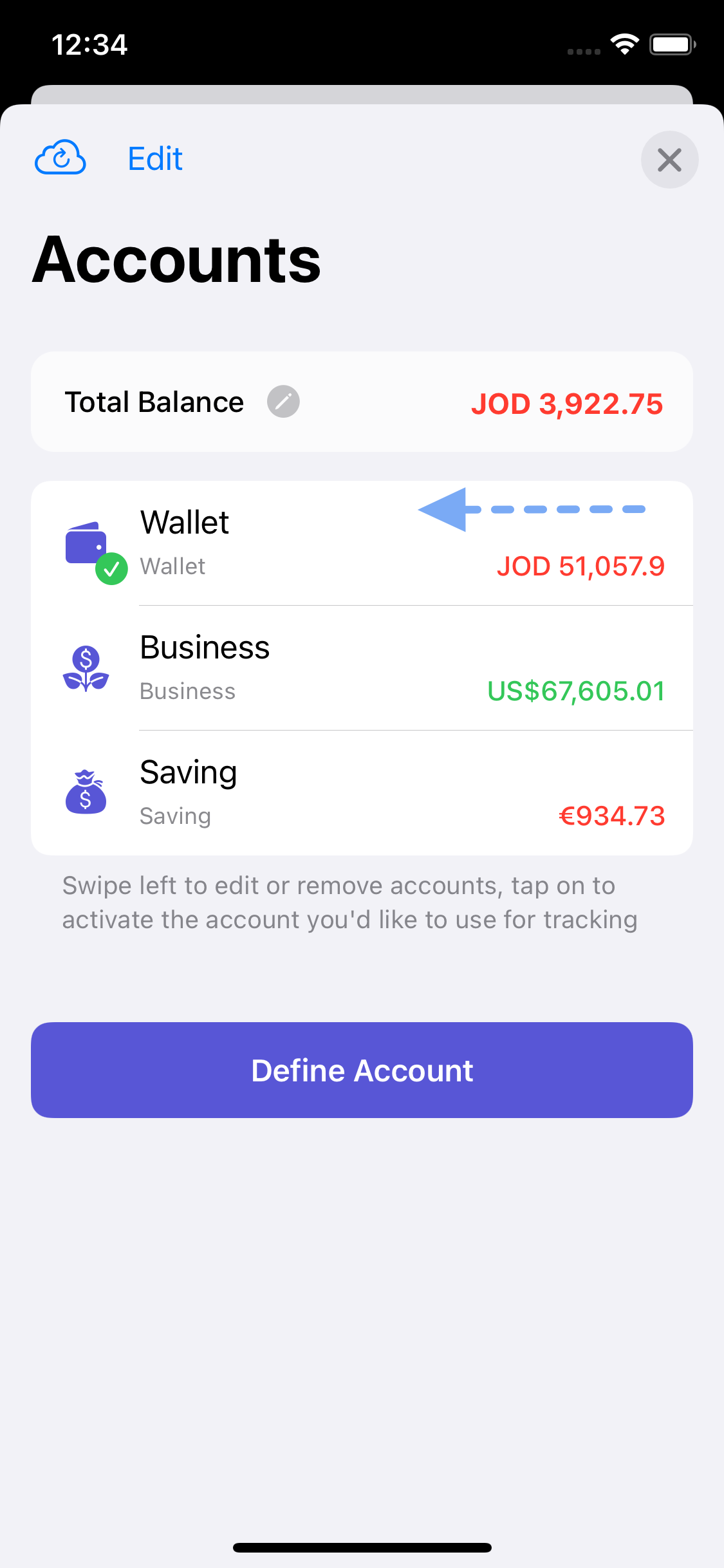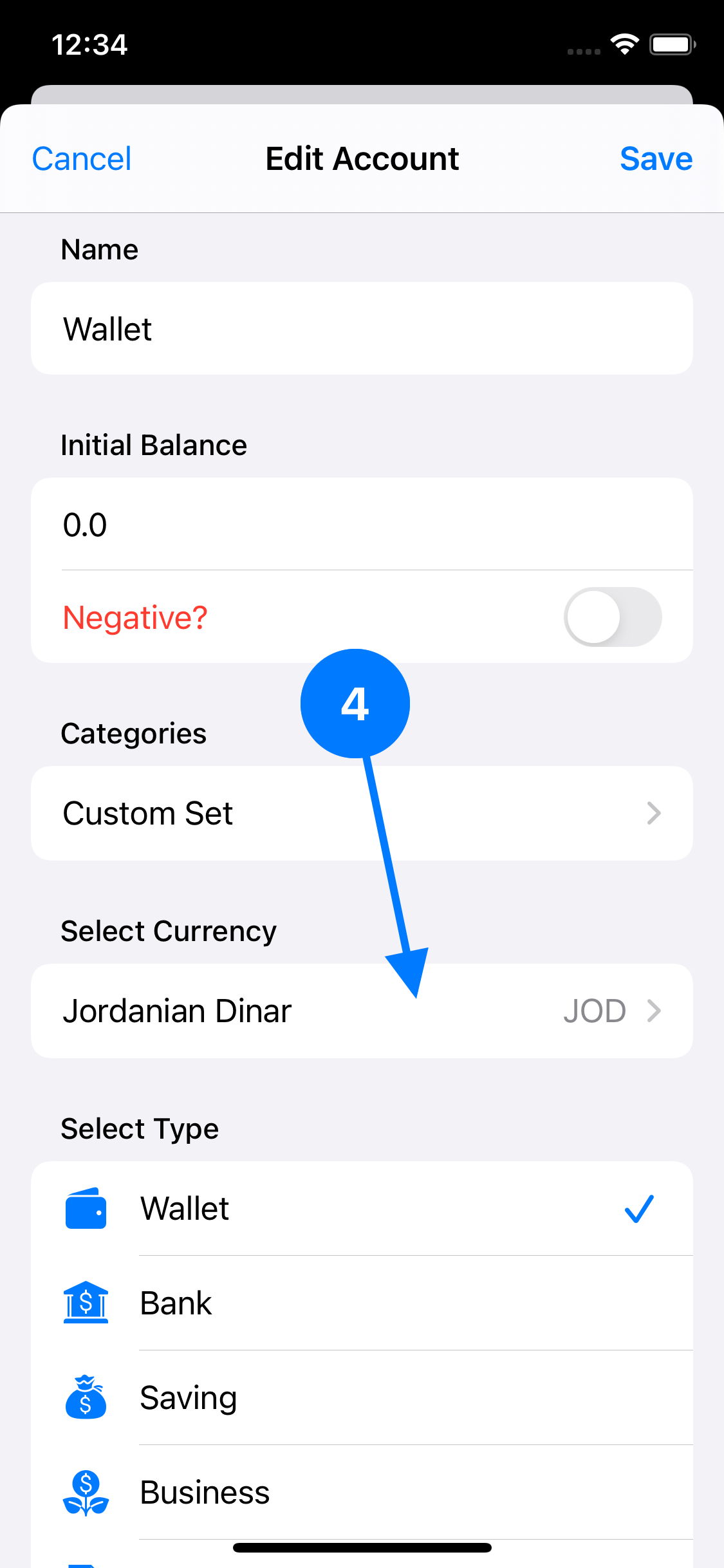 You can do this through More > Accounts > (swipe left on the desired account) then select Edit > then select yours from Select Currency field.